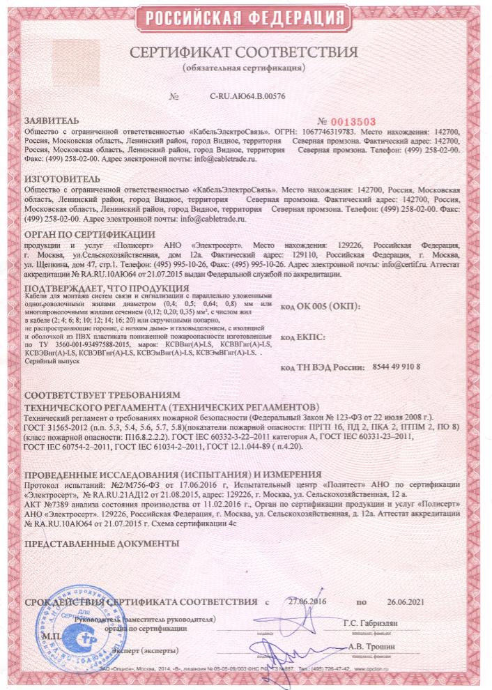 Кабель с однопроволочными медными жилами, с изоляцией из композиции полиэтилена, экран выполнен из алюмопластмассовой ленты с продольной прокладкой дренажной жилы из луженого медного проводника, с оболочкой из белого ПВХ пластиката, предназначен для внутренней стационарной прокладки.