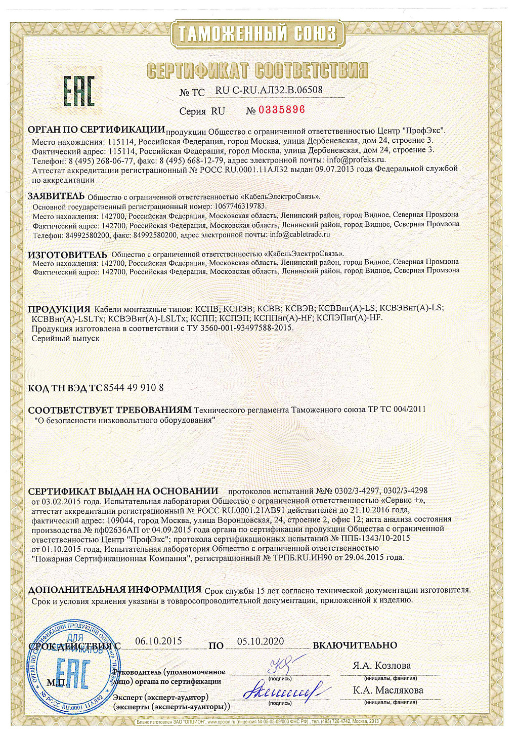 Кабель с однопроволочными медными жилами, с изоляцией из композиции полиэтилена, с оболочкой из белого ПВХ пластиката, предназначен для внутренней стационарной прокладки.