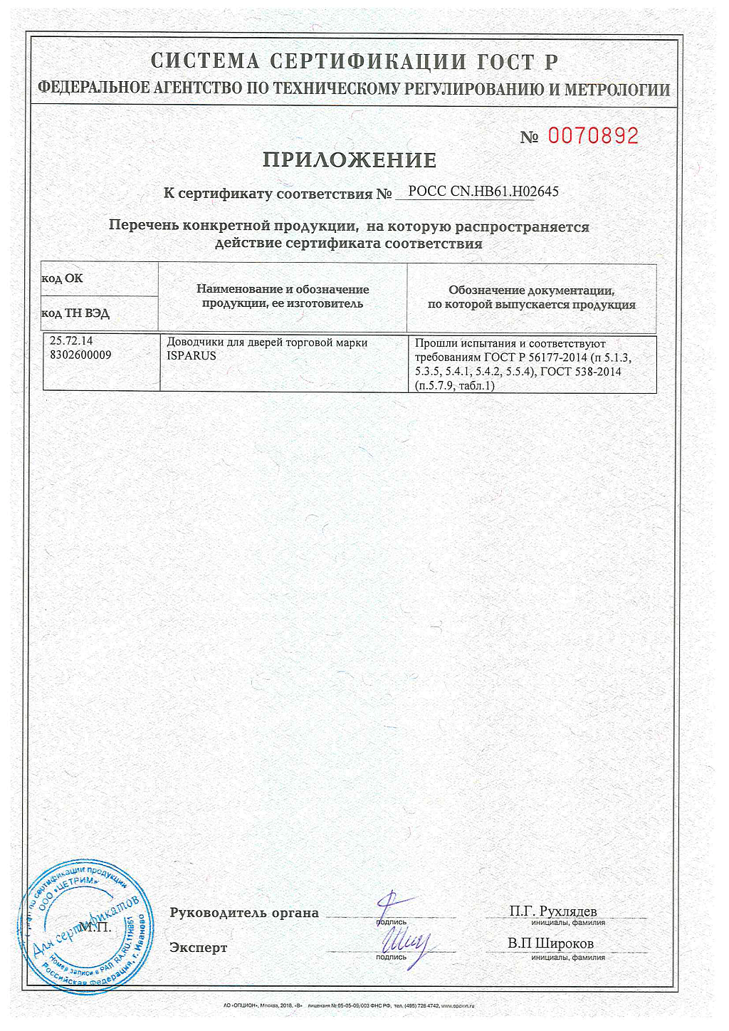 Доводчик 430 произведен с соблюдением всех требований государственных стандартов качества. Сертифицирован по ГОСТ Р на надежность работы - его ресурс составляет не менее 500 000 циклов.