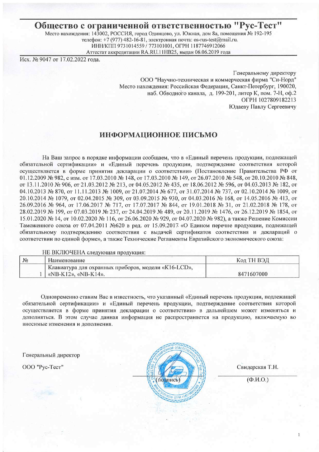 Клавиатура K16-LCD (Hunter, Captain, Nord) Си-Норд купить в Кирове в компании ВИПАКС.
