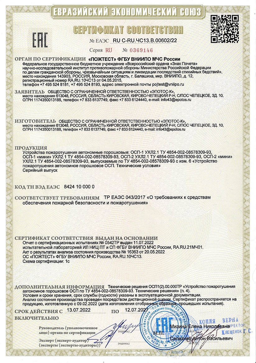 Самосрабатывающие огнетушители ОСП-1 включены в утвержденные указанием МПС России "Нормы оснащения объектов и подвижного состава федерального железнодорожного транспорта первичными средствами пожаротушения", разработаны и изданы "Методические указания по проектированию установок модульного порошкового пожаротушения для защиты специального подвижного состава", "Технические требования к противопожарной защите специального подвижного состава", в которые включены примеры расчета и обоснование выбора требуемого количества самосрабатывающих огнетушителей ОСП-1 для защиты специального подвижного состава. С 2000 года на всех постах контроля за температурой букс колесных пар железнодорожных вагонов внедряются системы противопожарной защиты.