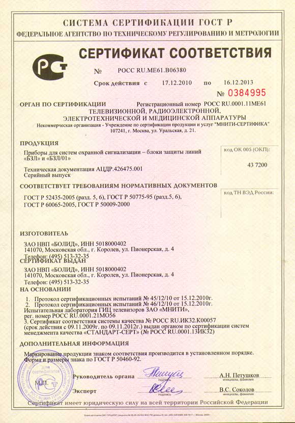 Сертификат соответствия Блок защиты линий БЗЛ BOLID